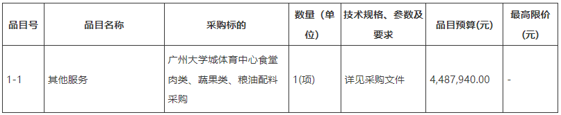 項(xiàng)目名稱(chēng):廣州大學(xué)城體育中心食堂肉類(lèi)、蔬果類(lèi)、糧油配料采購(gòu)項(xiàng)目(三次)
